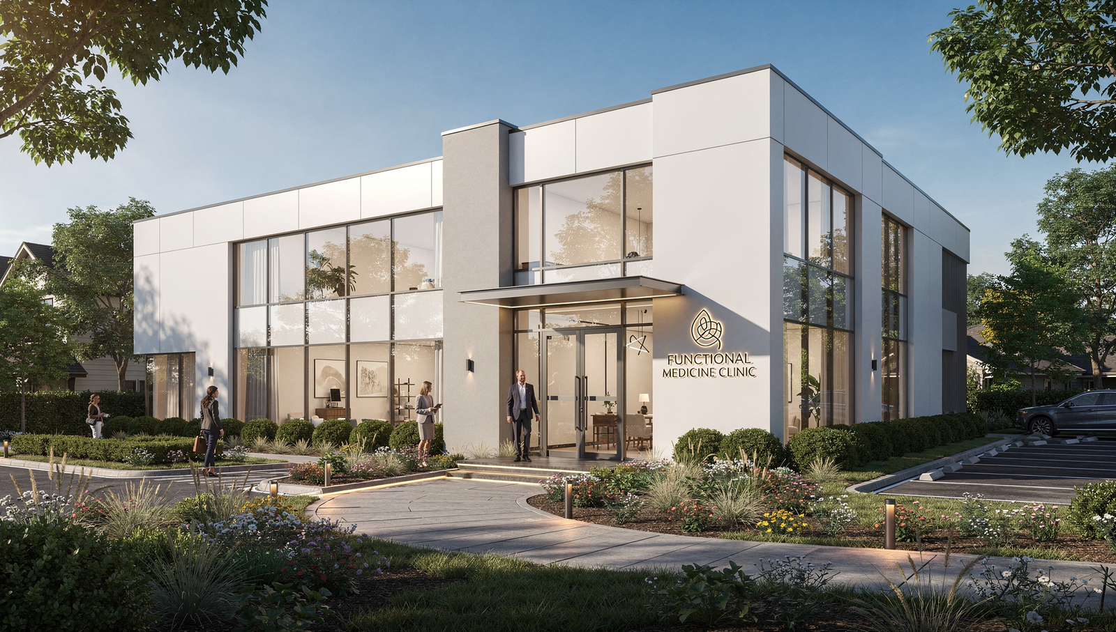 Functional medicine practitioner meeting a patient in a premium office